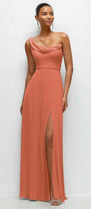 Chiffon One-Shoulder Maxi Dress with Draped Cowl Neckline in terracotta copper