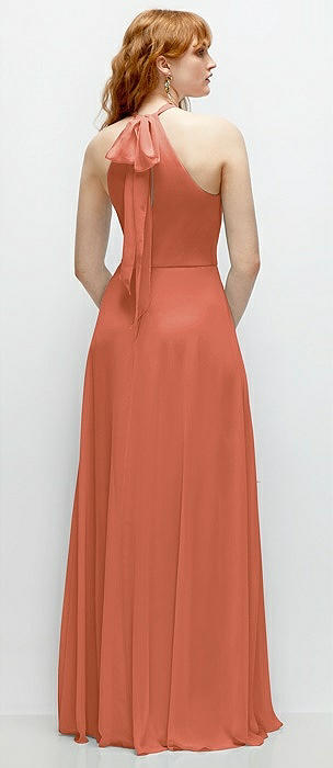Shirred Halter Chiffon Maxi Dress with Back Sash-Tie Closure in terracotta copper