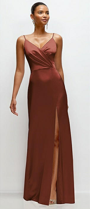 Pleated Faux Wrap Satin Maxi Dress with Adjustable Spaghetti Straps in auburn moon