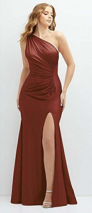 One-Shoulder Bias-Cuff Stretch Satin Mermaid Dress with Slight Train in auburn moon