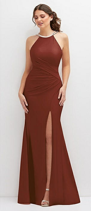 Halter Asymmetrical Draped Stretch Satin Mermaid Dress with Rhinestone Straps in auburn moon