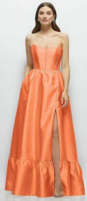 Strapless Cat-Eye Boned Bodice Maxi Dress with Ruffle Hem in portofino orange