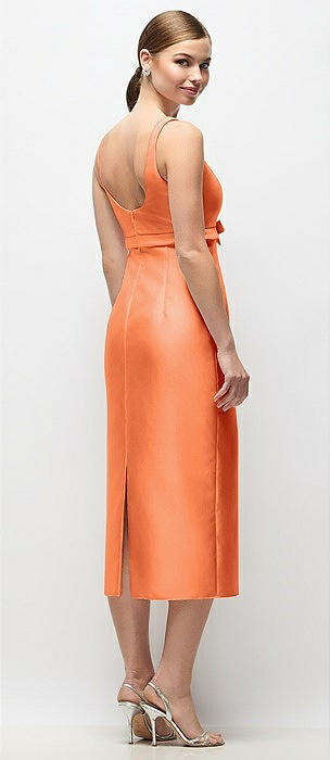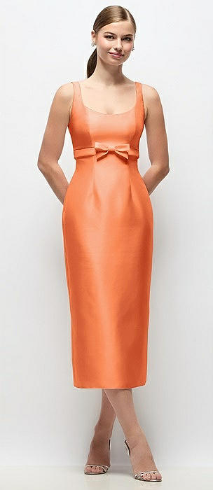 Scoop Neck Satin Column Midi Dress with Bow at Empire Waist in portofino orange