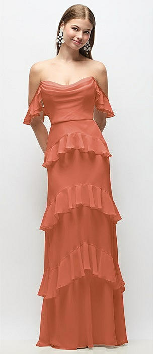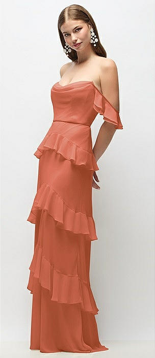 Off-the-Shoulder Cowl Chiffon Tiered Ruffle Maxi Dress with Convertible Ruffle Straps in terracotta copper