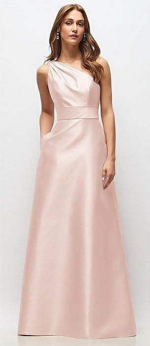 Bow One-Shoulder Fluid Satin Maxi Dress with Full Skirt in ballet pink