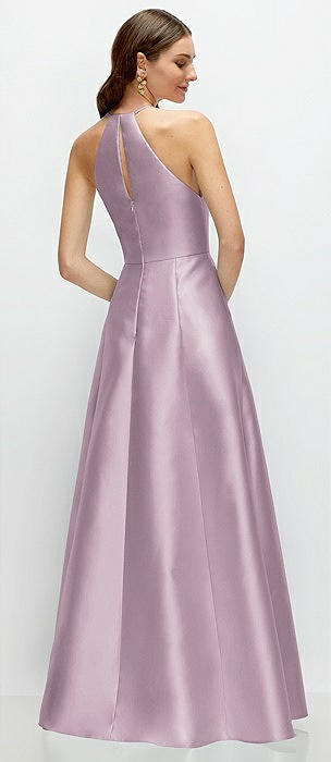 Jewel Neck Halter Full A-Line Satin Maxi Dress in lilac haze