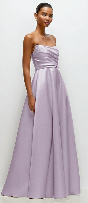 Strapless Draped Cat-Eye Satin Maxi Dress with Full Skirt in lilac haze