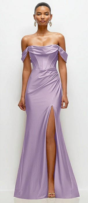Cowl Neck Off-the-Shoulder Stretch Satin Fit and Flare Corset Maxi Dress in pale purple
