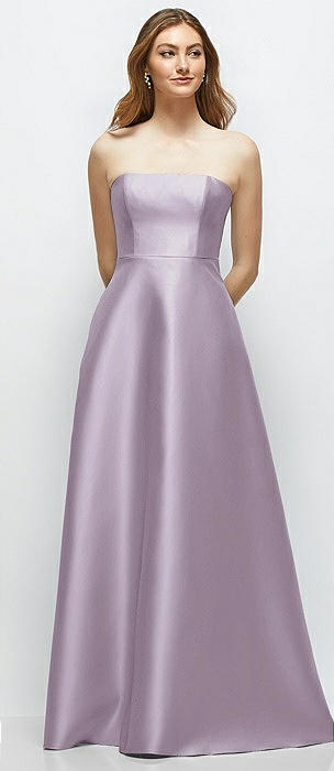 Strapless Satin Drop Waist Gown with Full Skirt in lilac haze