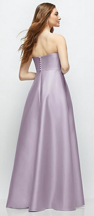 Strapless Satin Gown with Full Skirt and Covered Buttons at Back in lilac haze