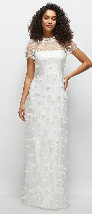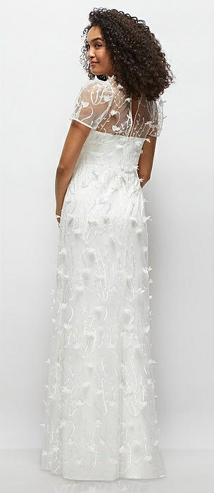3D Floral Embroidered Puff Sleeve A-line Maxi Dress with Petal-Adorned Illusion Neckline in ivory