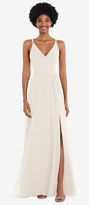 V-Neck Convertible Strap Bias Slip Dress with Front Slit in ivory