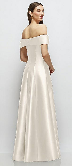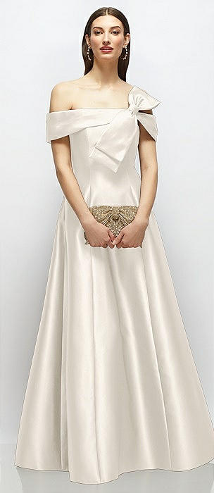 Asymmetrical Bow Off-Shoulder Satin Gown with Ballroom Skirt in ivory
