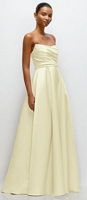 Strapless Draped Cat-Eye Satin Maxi Dress with Full Skirt in butter yellow