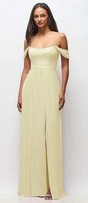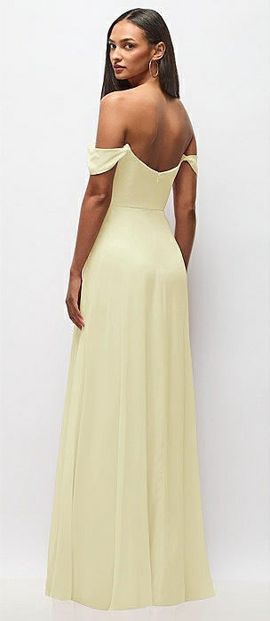 Bow-Shoulder V-Back Chiffon Gown with Front Slit in butter yellow