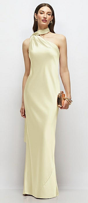 Draped Scarf One-Shoulder Bias Stretch Satin Maxi Dress in butter yellow