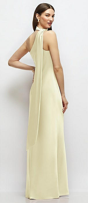 Draped Scarf Halter Open-Back Stretch Satin Bias Maxi Dress with Adjustable Straps in butter yellow