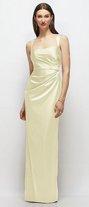 Strapless Draped Bodice Stretch Satin Column Maxi Dress in butter yellow