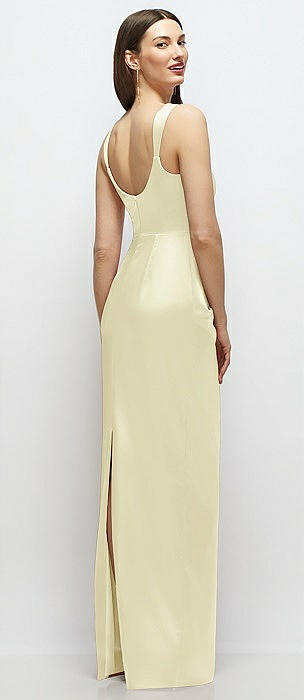 Scoop Neck Draped Column Stretch Satin Maxi Dress in butter yellow