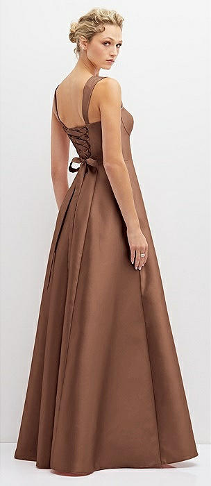 Lace-Up Back Bustier Satin Dress with Full Skirt and Pockets in cognac