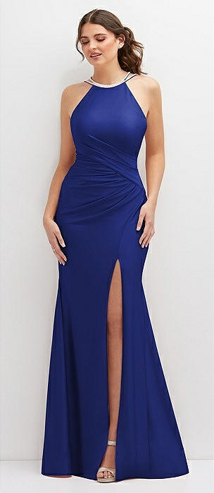 Halter Asymmetrical Draped Stretch Satin Mermaid Dress with Rhinestone Straps in cobalt blue