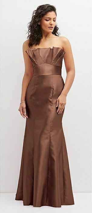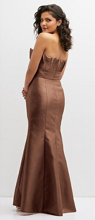 Strapless Basque-Neck Draped Stretch Satin Mermaid Dress with Horsehair Hem in cognac