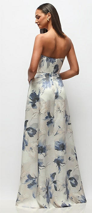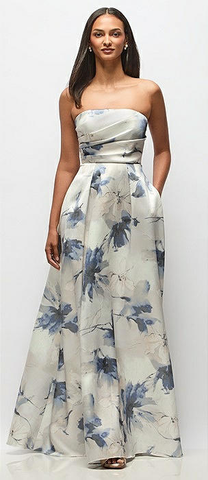Strapless Hand-Pleated Bodice Floral Satin Maxi Dress with Full Pleated Skirt in inkwash blue floral