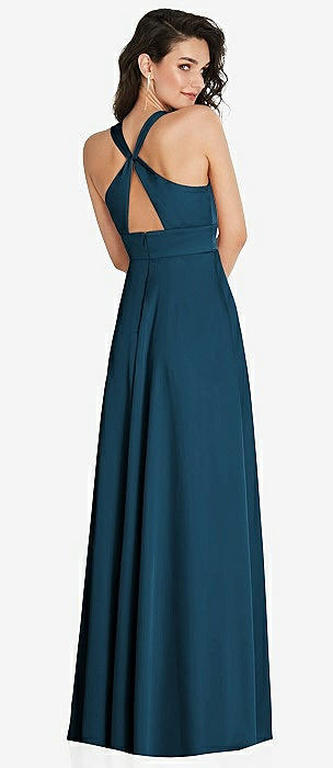 High Neck Backless Maxi Dress with Slim Belt in toasted sugar