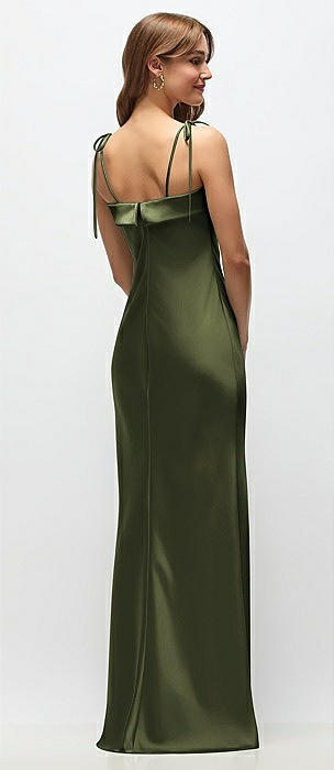 Cuff Neck Satin Bias Maxi Dress with Self-Tie Spaghetti Straps in olive green