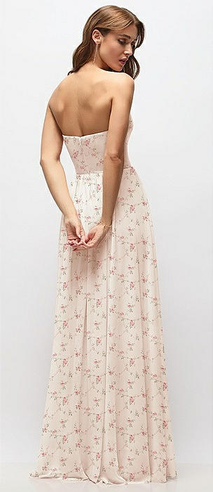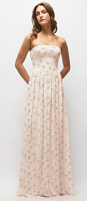 Strapless Basque Drop Waist Floral Chiffon Maxi Dress with Shirred Skirt in coquette floral print