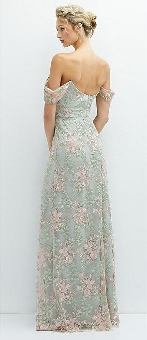 Off-the-Shoulder A-line Floral Embroidered Dress with Skinny Tie Sash