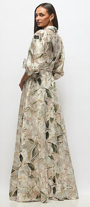 Floral Metallic Organza Jacquard Shirt Dress with Full Maxi Skirt & Sash