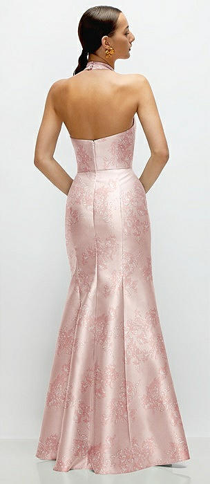 High-Neck Halter Open-Back Floral Satin Trumpet Dress in bow and blossom print