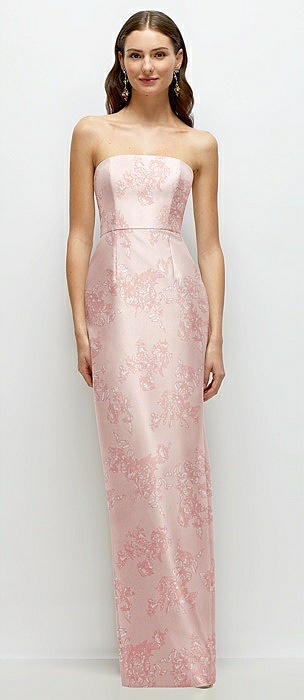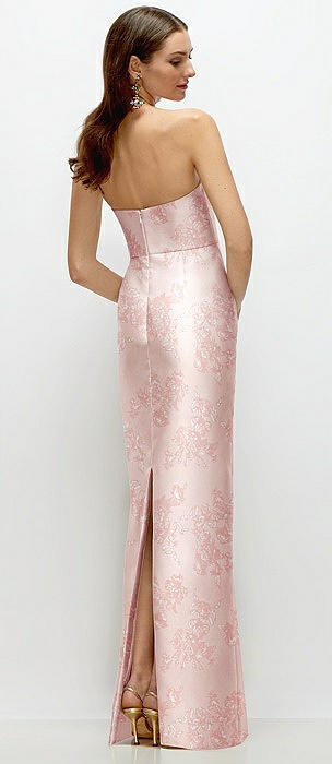Strapless Floral Satin Column Dress with Back Slit in bow and blossom print