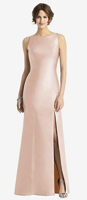 Jewel Neck Bowed Open-Back Trumpet Dress with Front Slit in blush