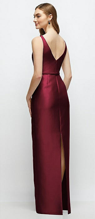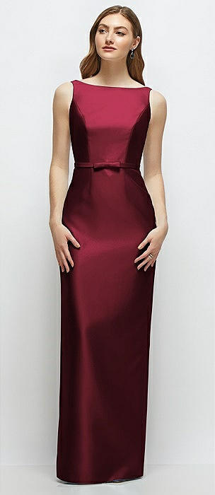 Bateau Neck Satin Column Dress with Bow-Trimmed Skinny Belt in cabernet
