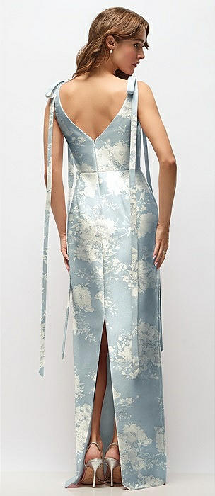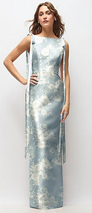 Floral Bateau Neck Satin Column Maxi Dress with Exaggerated Tail Bow Straps in porcelain blue seraphina floral