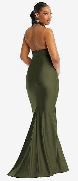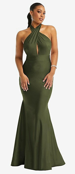Draped Twist Halter Tie-Back Trumpet Gown in olive green