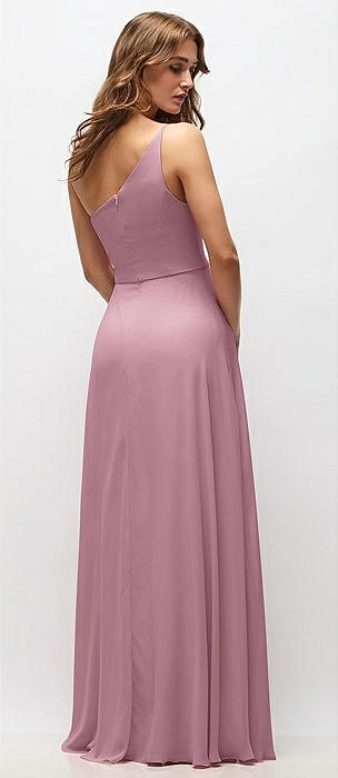One-Shoulder Chiffon Maxi Dress with Shirred Front Slit in dusty pink