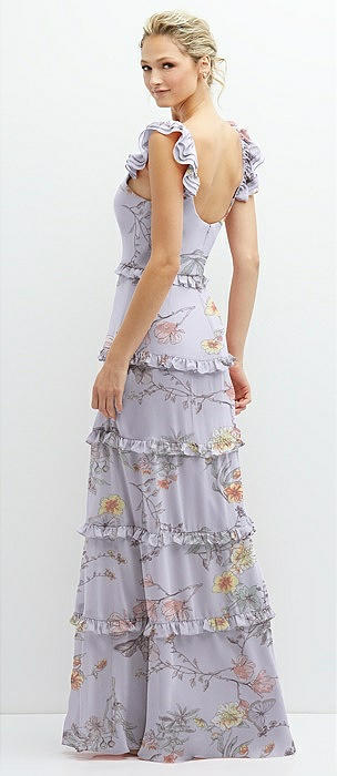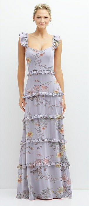Tiered Chiffon Maxi A-line Dress with Convertible Ruffle Straps in butterfly botanica silver dove
