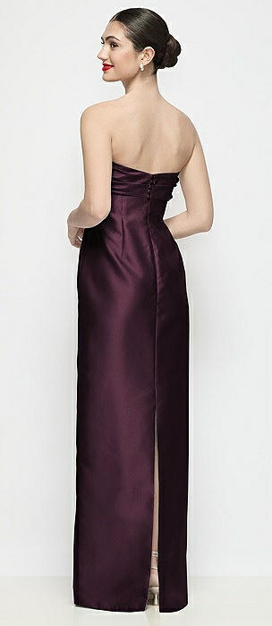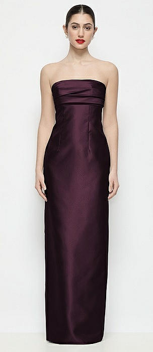 Strapless Pleated Empire Satin Column Maxi Dress in deep plum