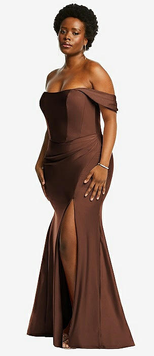 Off-the-Shoulder Corset Stretch Satin Mermaid Dress with Slight Train in cognac