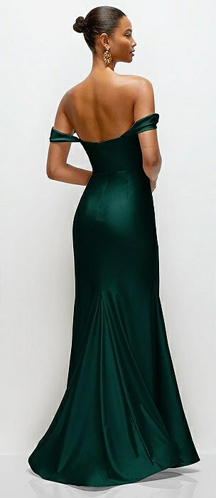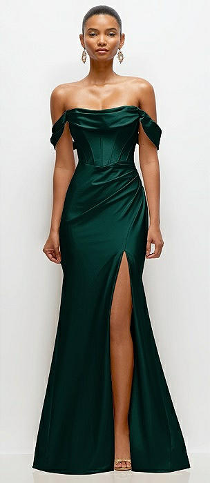 Cowl Neck Off-the-Shoulder Stretch Satin Fit and Flare Corset Maxi Dress in evergreen