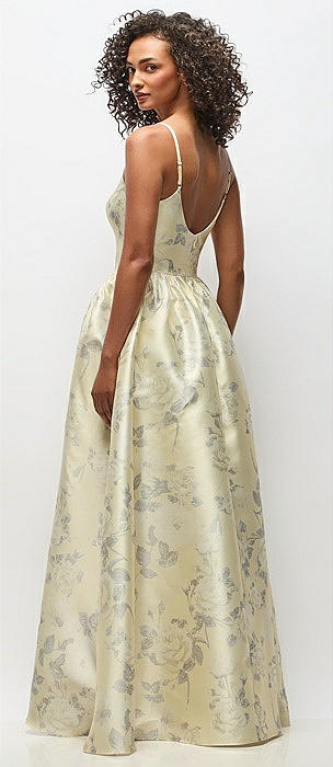 Scoop Neck Drop Basque Skirt Floral Satin Maxi Dress with Pockets in butter yellow floral