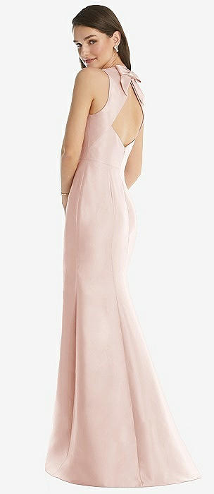 Jewel Neck Bowed Open-Back Trumpet Dress with Front Slit in blush