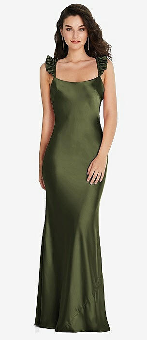 Ruffle Trimmed Open-Back Maxi Slip Dress in olive green
