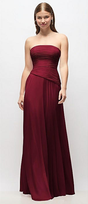 Strapless Chiffon Maxi Dress with Asymmetrical Ruched Drop Waist in burgundy