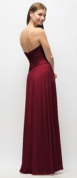 Strapless Basque Drop Waist Chiffon Maxi Dress with Shirred Skirt in burgundy