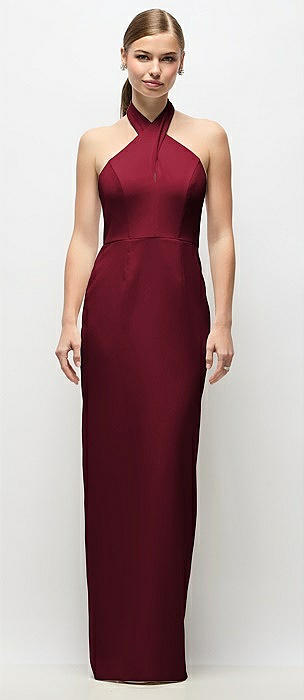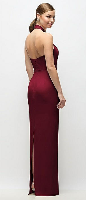 High-Neck Halter Open-Back Satin Trumpet Dress in burgundy