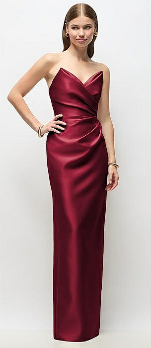 Strapless Asymmetrical Draped Satin Column Maxi Dress in burgundy